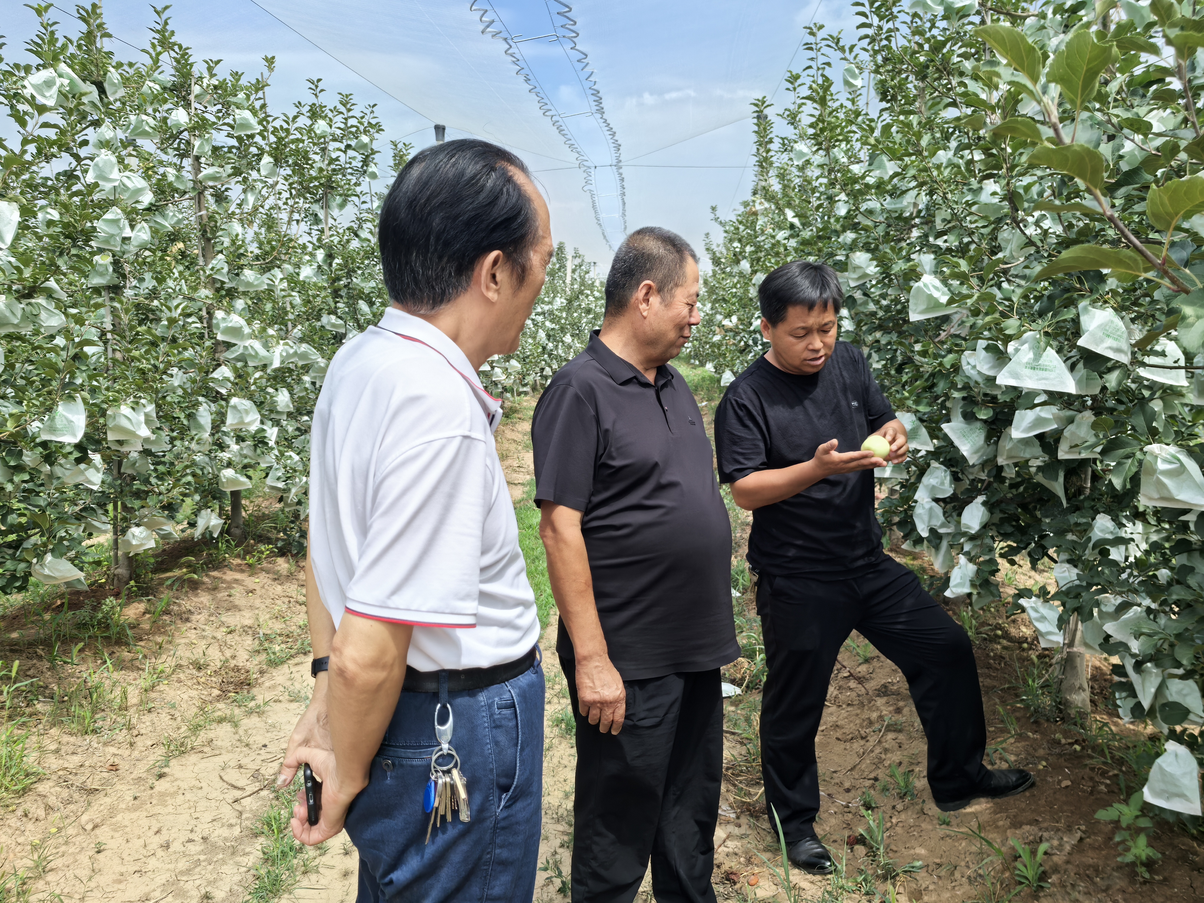8月7日,杨凌西农瑞雪瑞阳苹果发展联合会副会长吴万兴、秘书长王增信与淳化县园艺站站长赵小弟一行,深入淳化县天麒农业发展有限公司瑞雪苹果示范园,开展调研与技术指导。